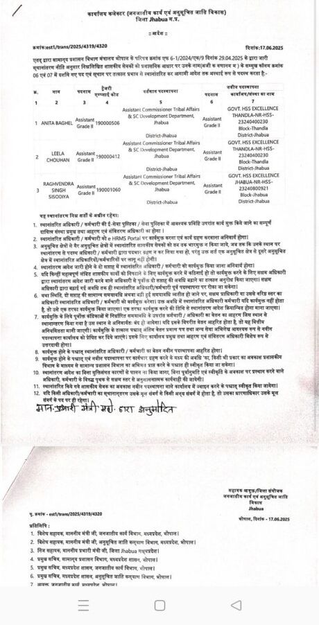 सहायक आयुक्त कार्यालय झाबुआ से कई कर्मचारीयो को जिले में तबादला किया