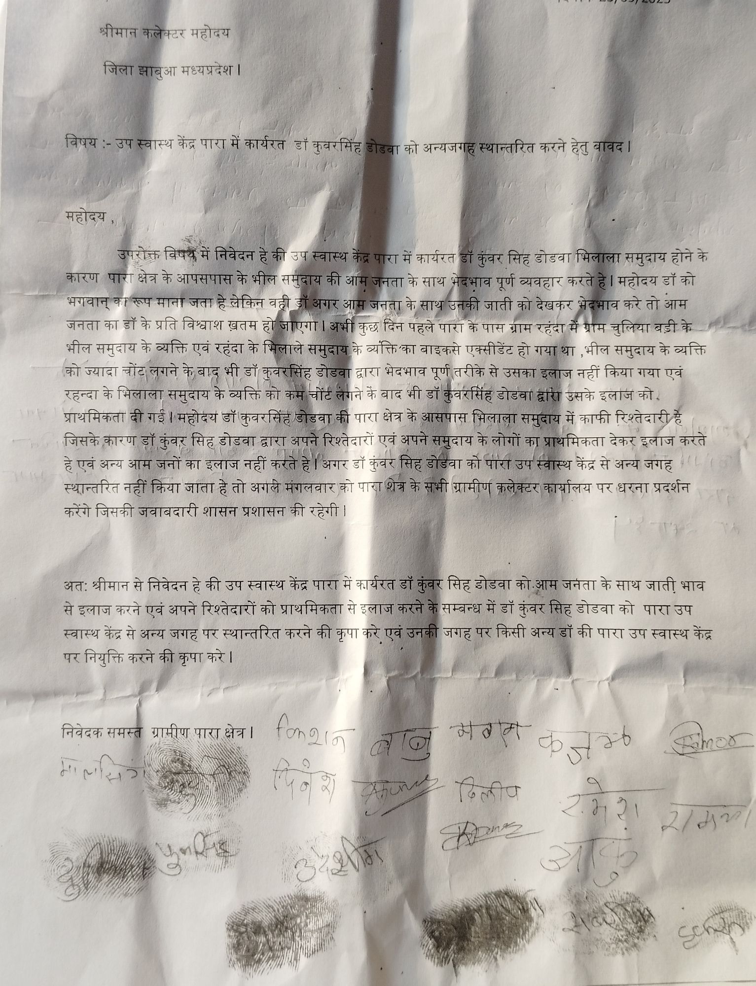 उप स्वास्थ केंद्र पारा में कार्यरत डॉ कुवरसिंह डोडवा के भेदभावपूर्ण व्यवहार को लेकर ग्रामीणों ने जनसुनवाई में आवेदन दिया