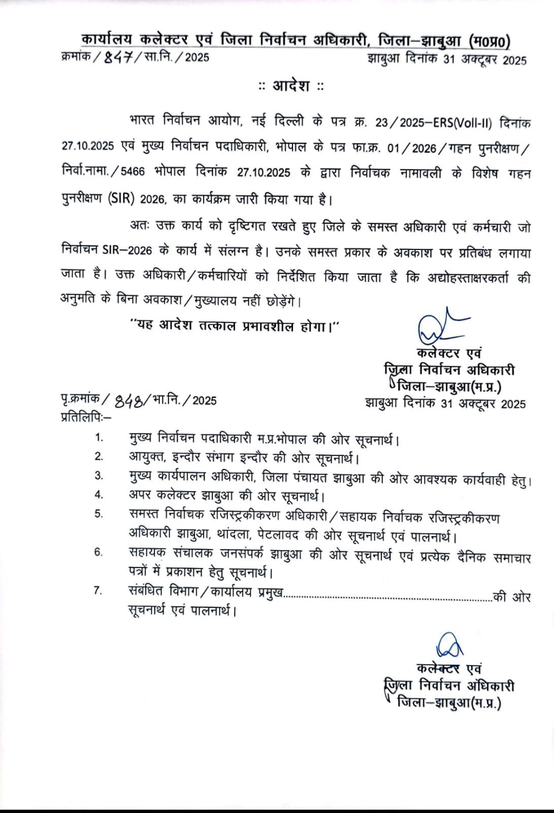 झाबुआ जिला प्रशासन ने घोषित किया – SIR 2026 कार्य में शामिल अधिकारियों/कर्मचारियों के लिए सभी प्रकार की छुट्टियों पर रोक