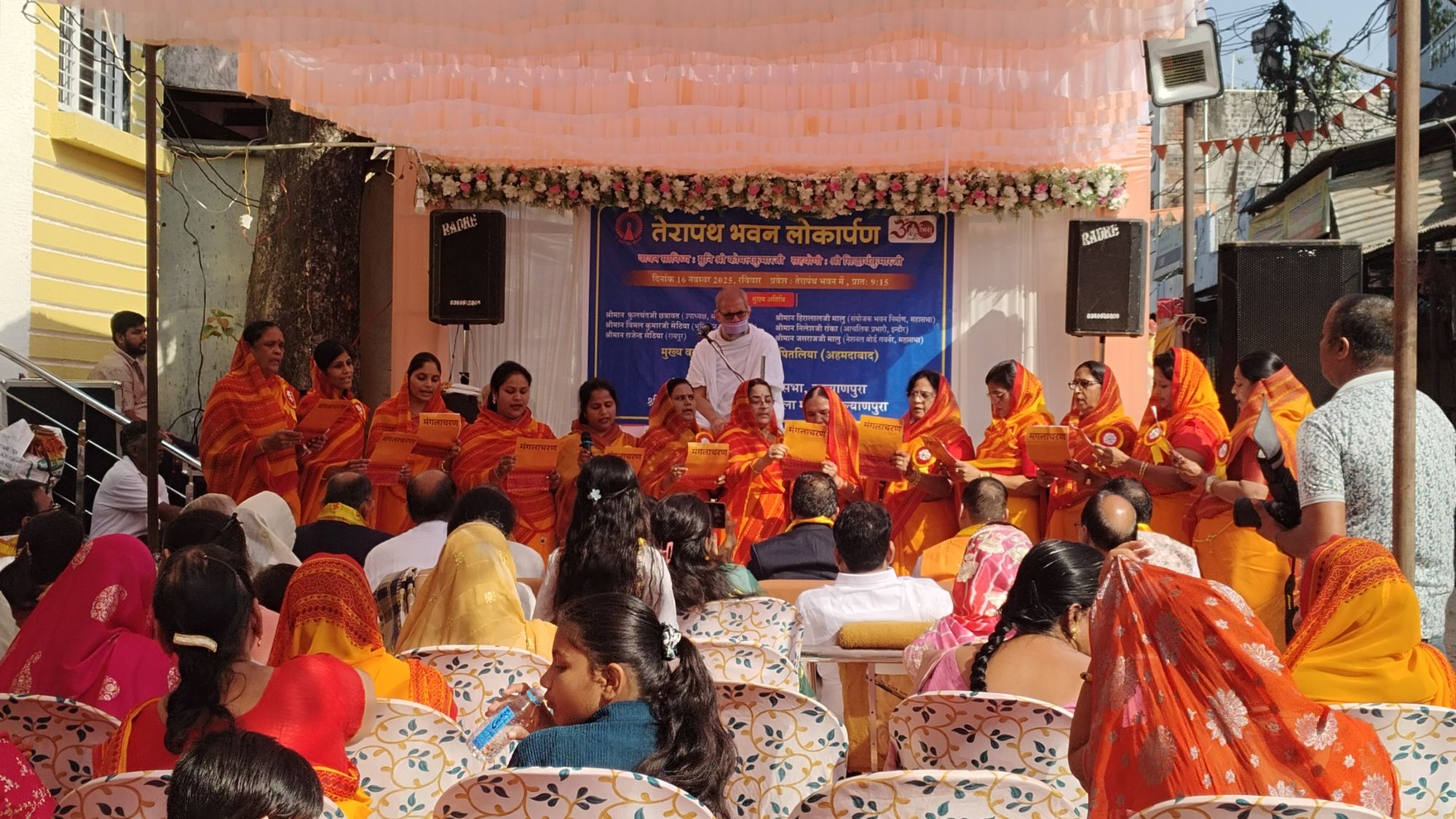 मुनि कोमल कुमार जी ने जय महावीर भगवान की गीतिका का संगान किया , पश्चात धर्मसभा को संबोधित करते हुए कहा कि मन के अन्दर अपना दीपक अपनी आत्मा को उज्ज्वलित कर सकता है भक्त से भगवान भी बना सकता है वहीं दीपक अंधकार में प्रकाश भी देता है व दीपक रखने के लिए स्थान का भी बड़ा महत्व है । वही धर्म आराधना के लिए भी स्थान का महत्व है जहां व्यक्ति अपनी आत्म साधना कर सकता है यह भी कहा संपूर्ण तेरापंथ समाज एक गुरु और उनकी मर्यादा में चलने वाले अनुशासित संघ है । इसके अलावा अन्य कई श्रावक श्राविकाओ ने भी अपनी भावनाएं व्यक्त की । कार्यक्रम में दिल्ली, नवसारी ,अहमदाबाद , इंदौर , सूरत आदि के अलावा झाबुआ, कालीदेवी , बोरी , रायपुरिया , पेटलावद, झकनावदा, करवड आदि अनेक चौखलो से श्रावक श्राविकाएं उपस्थित थे । इस कार्यक्रम का सफल संचालन मुनि सिद्धार्थ कुमार जी ने किया अंत में सभी का आभार प्रदीप पिपाडा ने किया ।
