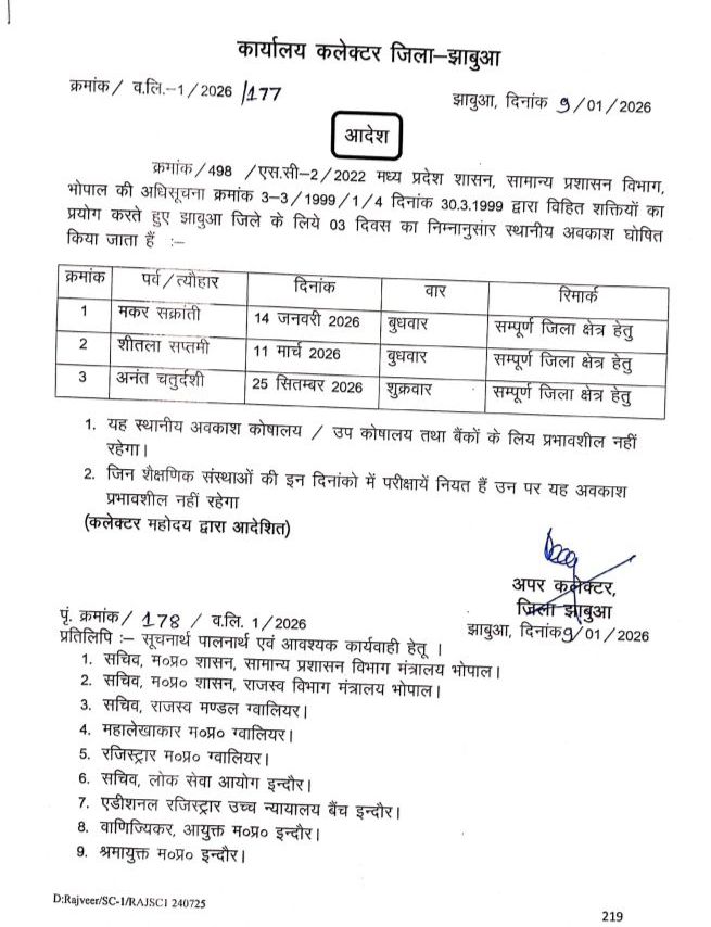 झाबुआ जिले में 3 स्थानीय अवकाश घोषित