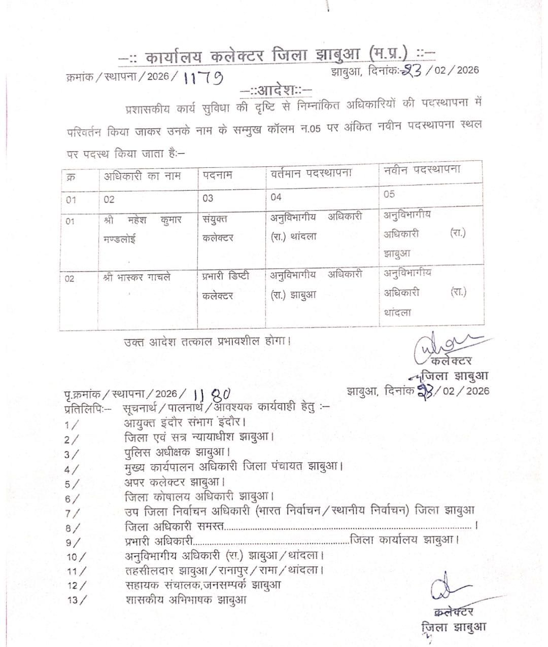 कलेक्टर ने झाबुआ एसडीएम को हटाया… आदेश जारी